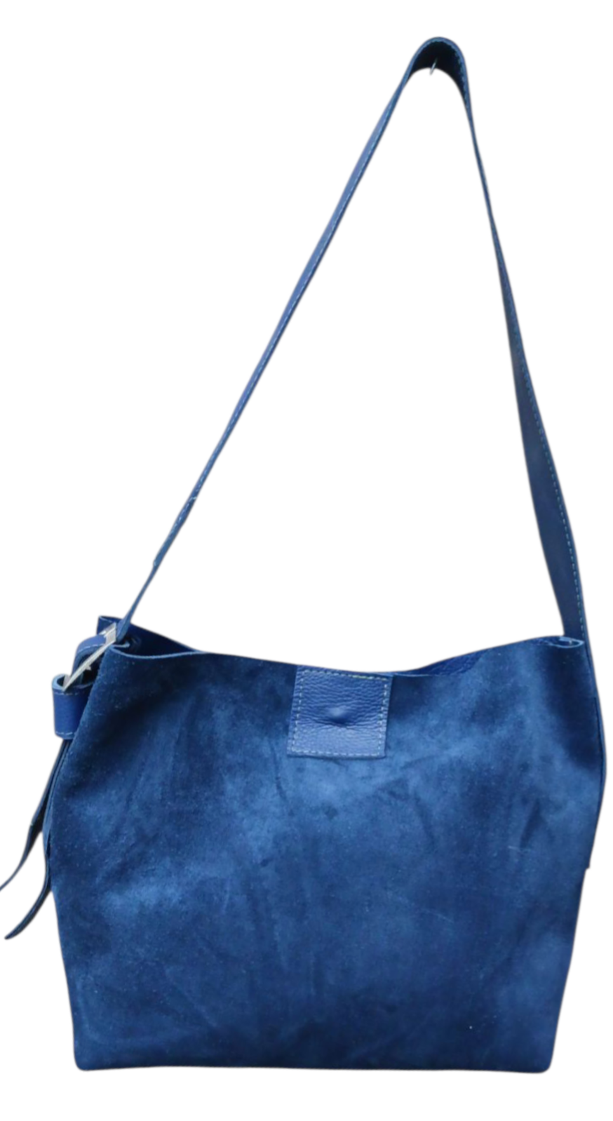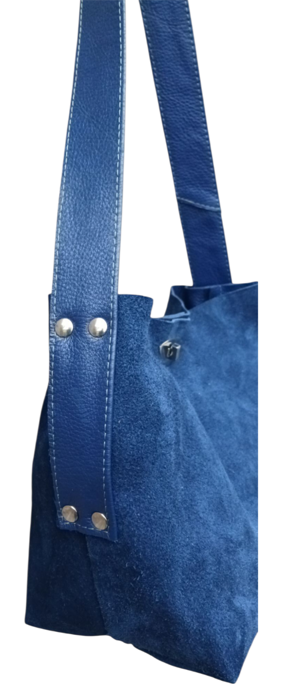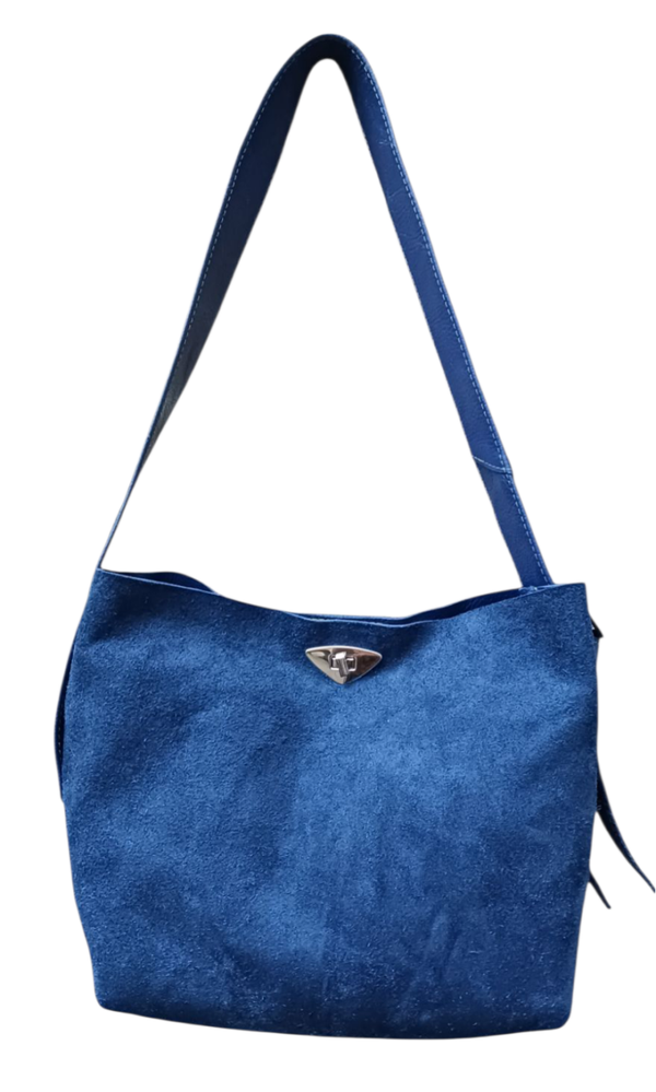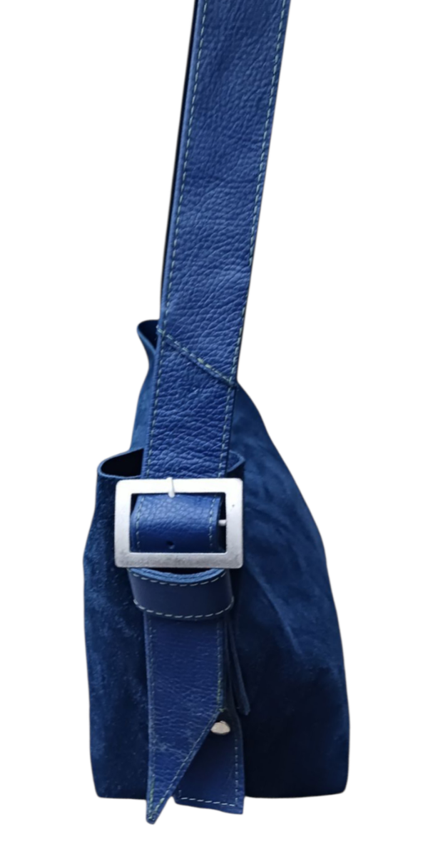 Bij deze MoosTas is de suède kant van het leer gebruikt, de verstelbare schouderriem is van leer. De tas meet ±25x35 cm, de bodem is 15 cm breed. Binnenin de tas een vak met rits. De tas sluit met een zilverkleurige draaisluiting. Leuk detail is de vintage gesp.