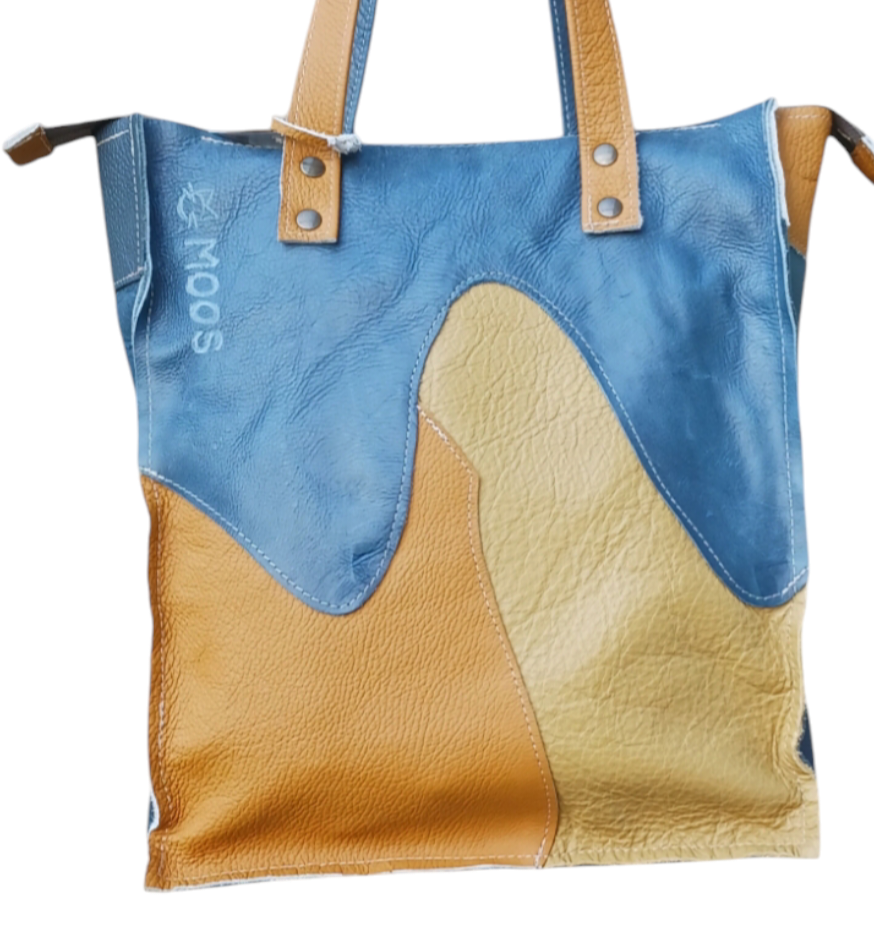 Van deze MoosTas wordt je echt vrolijk! Fijne tas om mee te shoppen maar ook prima te gebruiken als werktas. De tas mees ±30x35 cm en is gemaakt van reststukken leer van de meubelmaker. Aan de binnenzijde een vakje voor je telefoon en een vakje met rits. Zelfs nog een sleutelclip zodat je nooit meer naar je sleutels hoeft te zoeken.