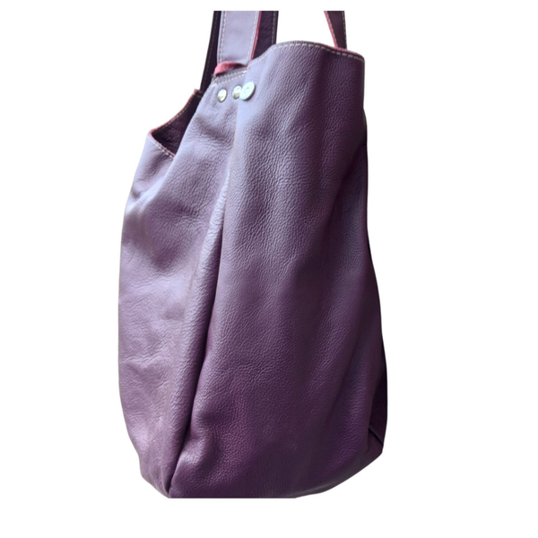 MoosTas 'Big Bag Aubergine' is echt multifunctioneel, gemaakt van gerecycled leer. Door de drukknopen aan de zijkant is de tas iets ruimer te maken.