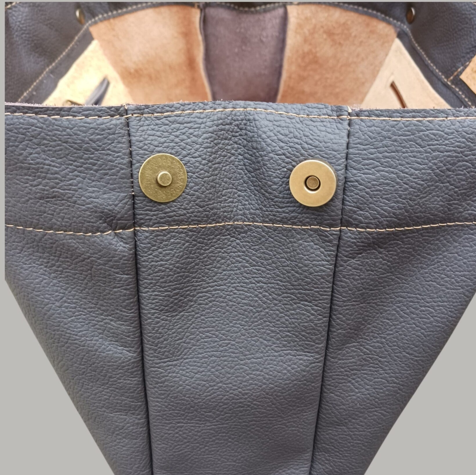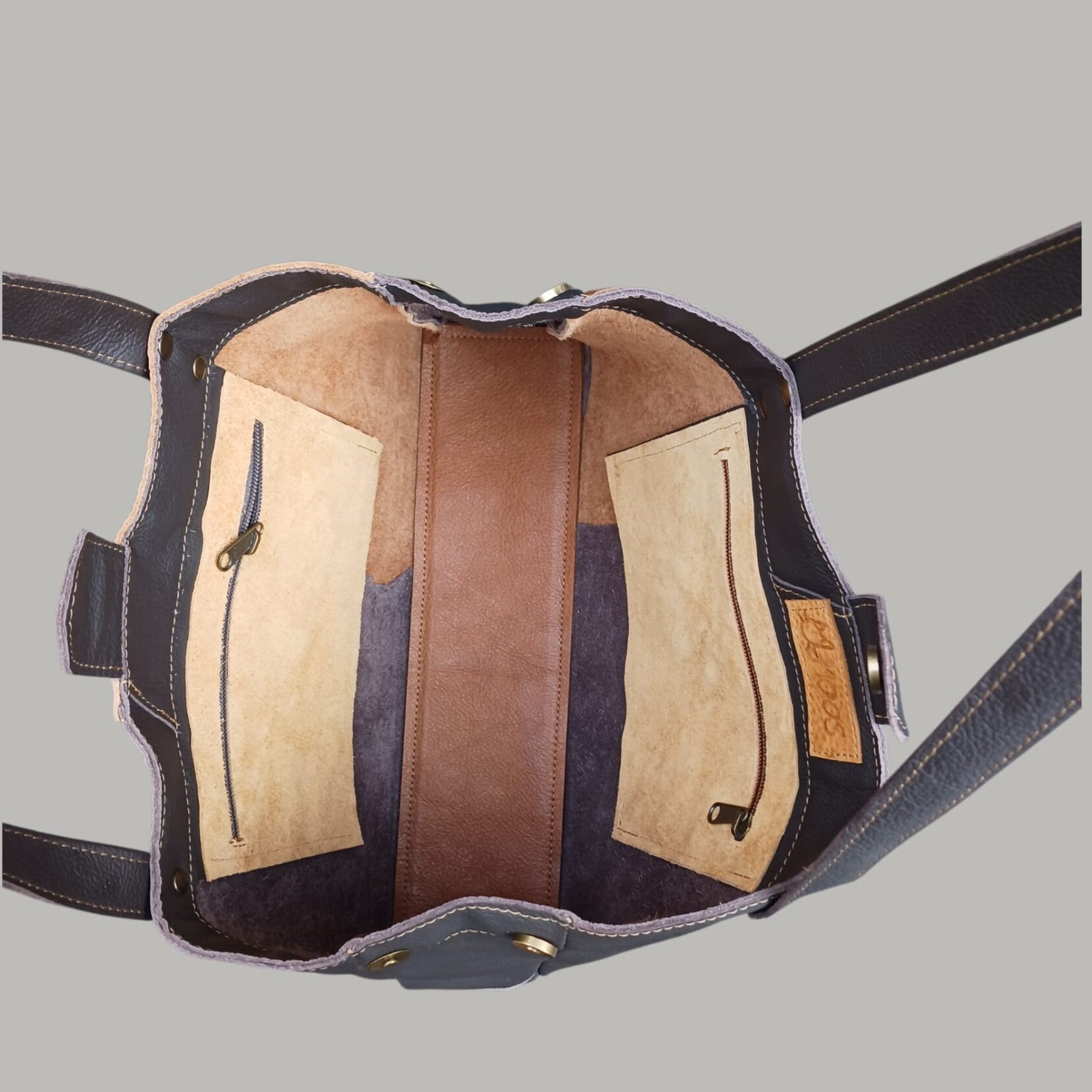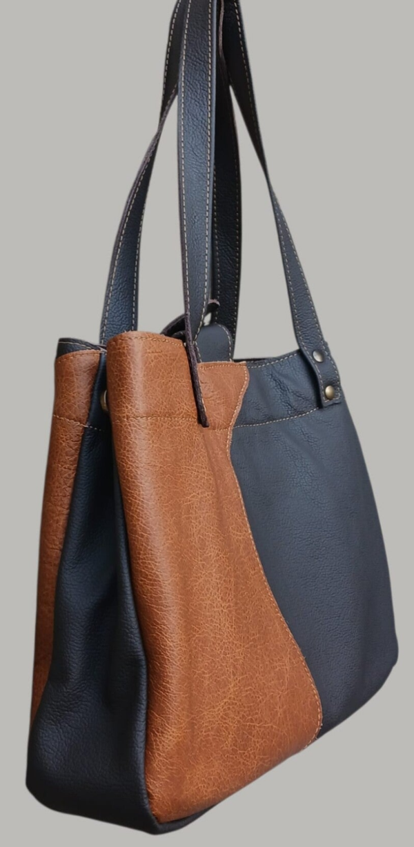 Woking Bag 2 is gemaakt van twee kleuren bruin van upcycled leer. Deze unieke tas meet ±27x40cm. Aan de zijkant twee drukknopen waarmee je de tas groter kan maken. Aan de binnenzijde twee vakken met een rits. De tas sluit met een drukknoop. De bodem is extra verstevigd. Zelfs een groot model laptop past prima in deze tas. De draagriemen meten ±65cm, hierdoor kan de tas als schoudertas gedragen worden maar zeker ook als handtas.