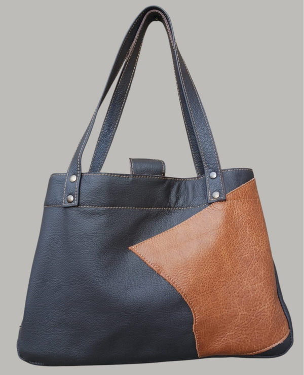 Woking Bag 2 is gemaakt van twee kleuren bruin van recycled leer. Deze unieke tas meet ±27x40cm. Aan de zijkant twee drukknopen waarmee je de tas groter kan maken. Aan de binnenzijde twee vakken met een rits. De tas sluit met een drukknoop. De bodem is extra verstevigd. Een groot model laptop past prima in deze tas. De draagriemen meten ±65cm, hierdoor kan de tas als schoudertas gedragen worden maar zeker ook als handtas.