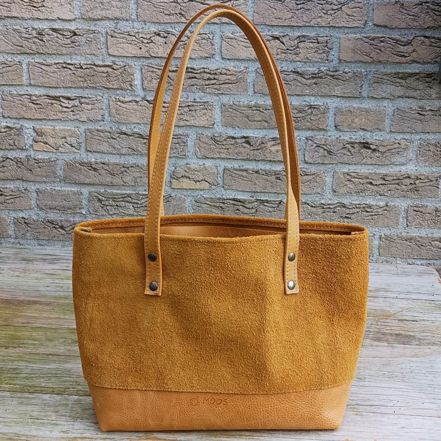 Deze tas is gemaakt van een stevige kwaliteit recycled leer, hierbij is ook de suédekant van het leer gebruikt. De tas is als schoudertas maar ook als handtas te gebruiken. De tas heeft geen aparte sluiting maar wel twee vakken aan de binnenzijde, waarvan één met rits. De bodem is gemaakt van de gladde kant van het leer.