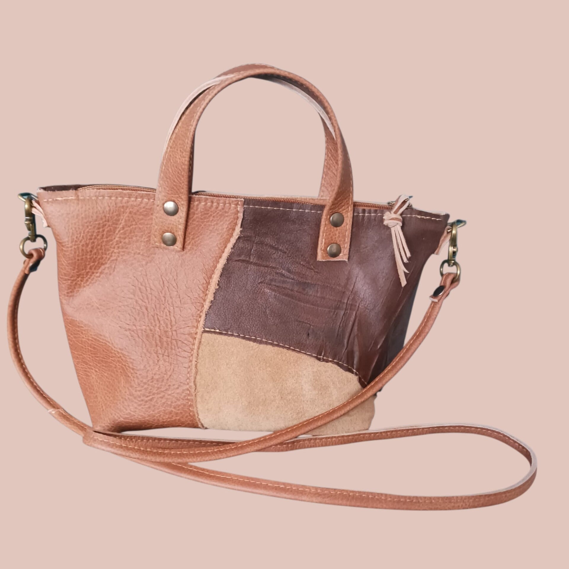Shorty is gemaakt van recycled leer, reststukken van de meubelmaker. Door de verschillende kleuren en leersoorten is ook Shorty een unieke handtas met een extra schouderriempje. De afmeting is ±20x30cm. De extra brede bodem meet ±10 cm. De tas sluit met een rits en heeft aan de binnenzijde twee vakjes met rits.