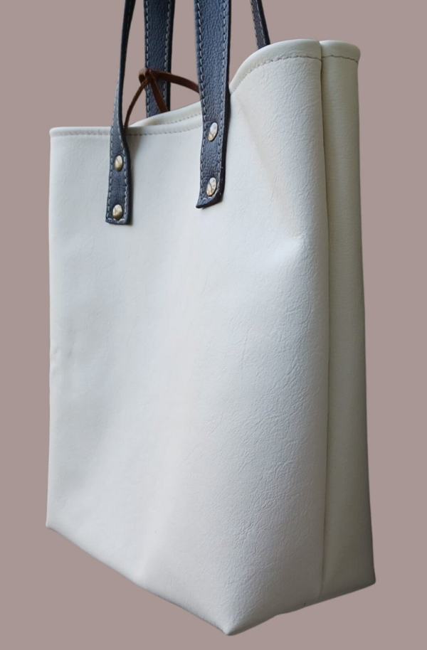 Citybag White is gemaakt upcycled leer in de kleur 'gebroken wit'. De schouderriemen zijn van donkerbruin leer. De tas is te dragen als schoudertas zowel als handtas. Aan de binnenzijde twee vakken, waarvan één met rits.