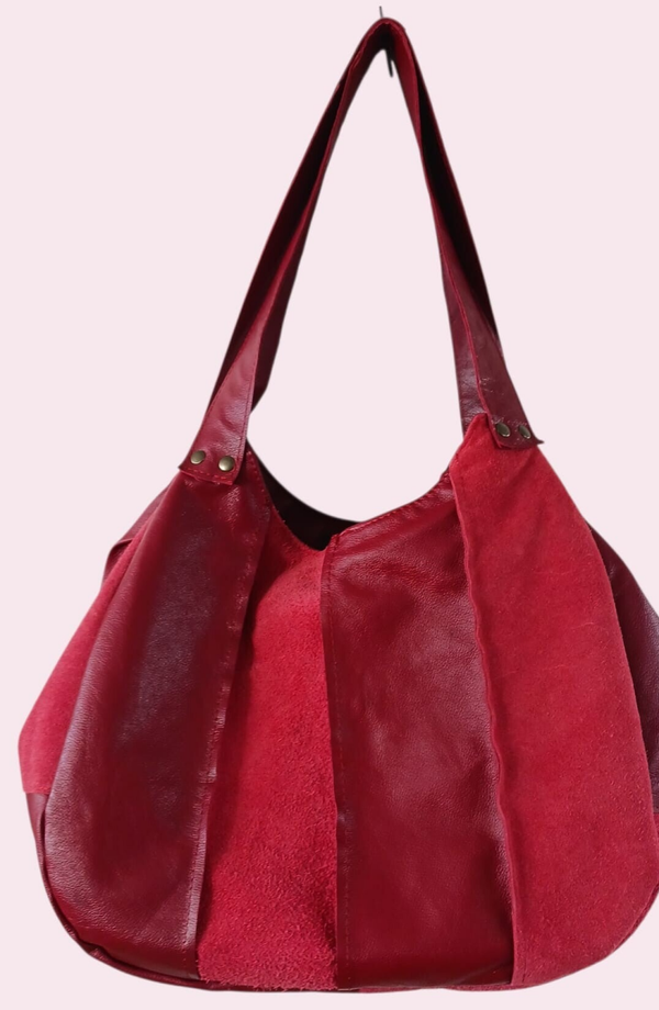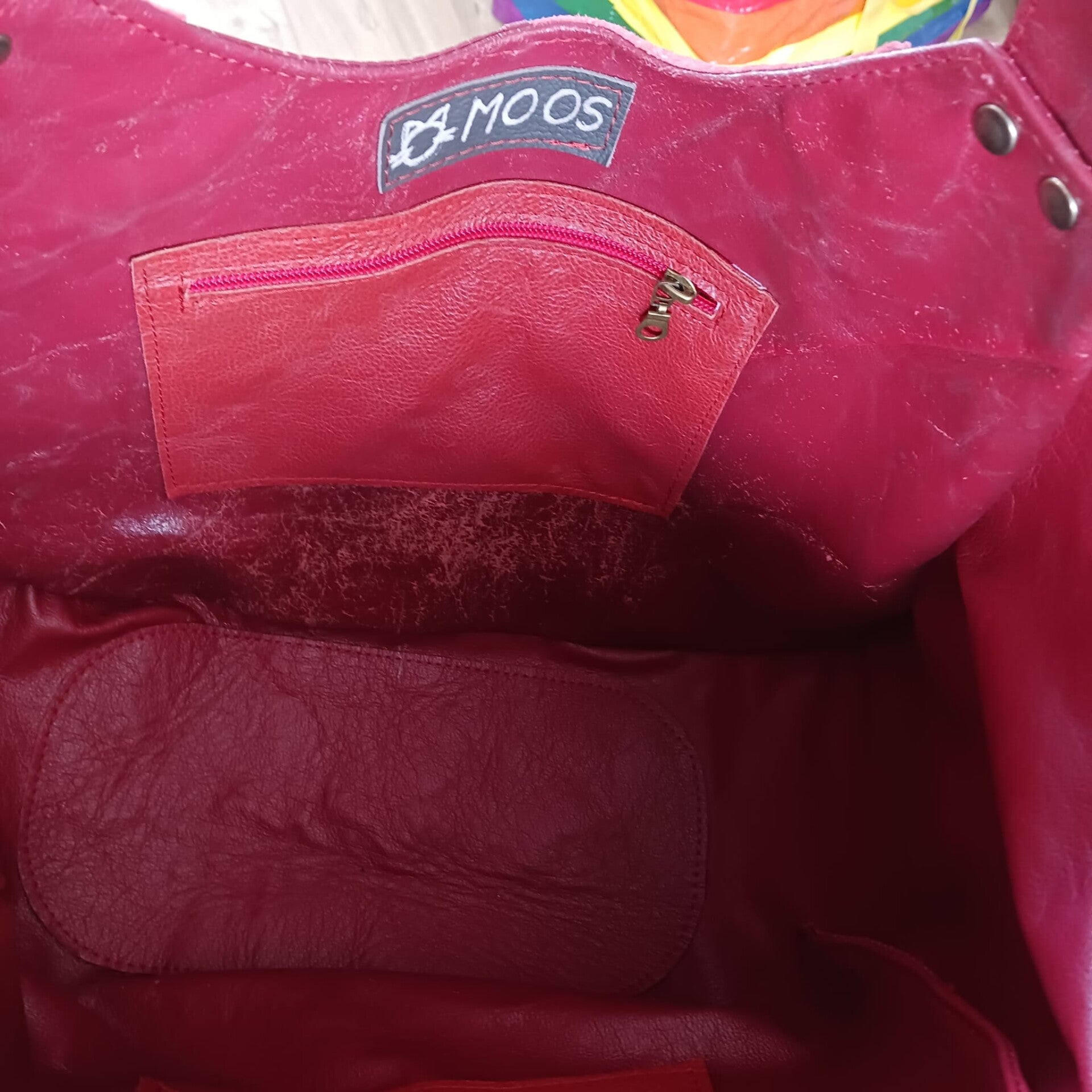 'Big Bag Red Chique' is echt een chique Moostas, gemaakt van het leer van een oud Wassenaars stoeltje. De tas is gevoerd met hetzelfde leer en daardoor extra stevig. De tas meet ±30x45cm, de breedte is ±20 cm. Door de drukknopen aan de zijkant is de tas verstelbaar. Aan de binnenzijde twee vakjes met rits. Recycled leer.